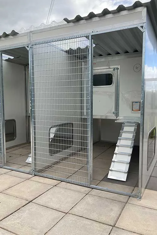 We do a standard size exercise run area which you can select to come with this unit at 1.5m wide x 2m long. this is made with solid white sides/dividing panels and has 1×3 inch mesh gates which have infill facia above, this also comes with a choice of solid or translucent roofing sheets over the run area.